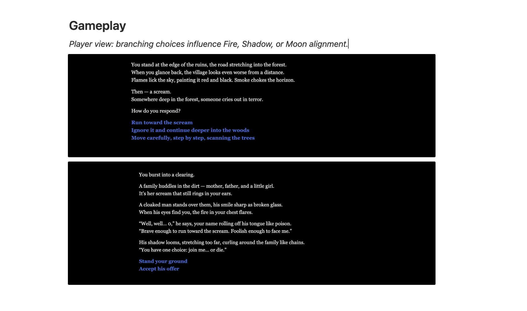 You awaken in a ruined village with only fragments of memory. Guided by whispers of Fire, Shadow, and Moon, your choices shape not only your path but the power that stirs within you.